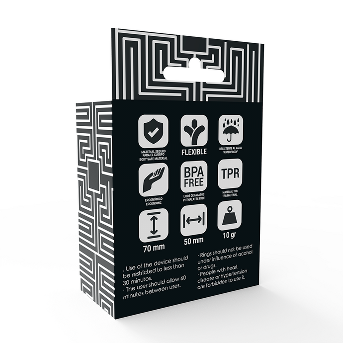 This two-ring set is specially designed to be used simultaneously at the base of the penis and at the base of the testicles.