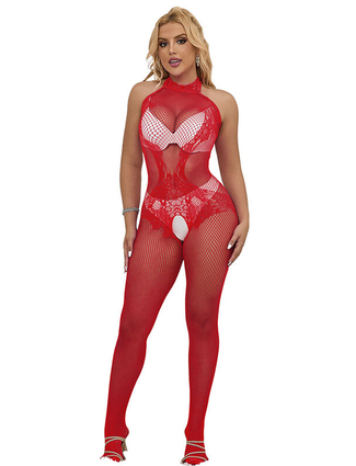 SUBBLIME - 952372 FISHNET AND LACE CROTCHLESS BODYSTOCKING WITH HIGH NECK RED ONE SIZE