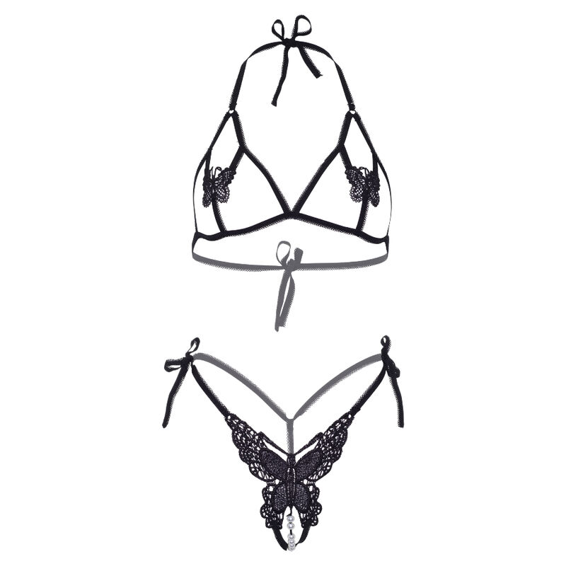 LEG AVENUE - TWO PIECES SET BRA AND PANTY OF BUTTERFLIES & PEARLS ONE SIZE - BLACK