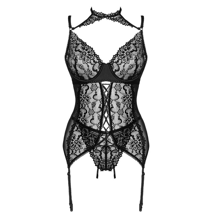 The Giellandra corset for the senses is a set of the luxurious Polish brand LivCo Corsetti Fashion, consisting of 2 elements - a corset and a thong. The underwear is in a classic black color. The corset is fastened with hooks, which allows adjustment and guarantees comfort. It is also possible to adjust the length of the straps and attach stockings, which will greatly diversify the styling. This is a perfect proposition for women who value comfort, but do not want to give up a sensual appearance. The underwear is made of 90% polyamide and 10% elastane. This combination of materials makes the outfit very flexible and does not restrict movement. The set includes decorative inserts made of durable lace that emphasize feminine shapes in all the most important places. The cut and binding on the belly make the corset sophisticated and at the same time leave room for imagination. An unusual element is a choker that will draw attention to the neck and collarbones. This sexy corset will certainly spice up many romantic evenings.