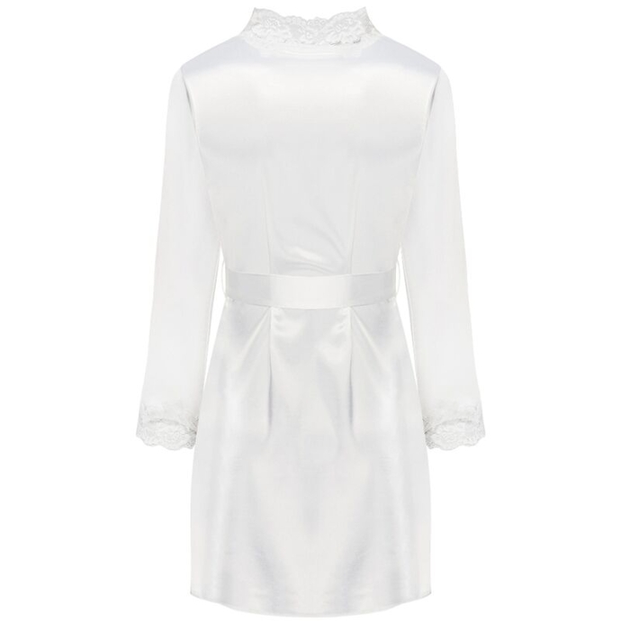 An exceptionally beautiful set of underwear made of shiny ecru satin, a bathrobe with a chemise, reaching to mid-thigh. The front and long sleeves of the dressing gown tied at the waist with a belt are decorated with beautiful lace. T-shirt with thin, adjustable straps, decorated with the same lace at the bust. Thong included.