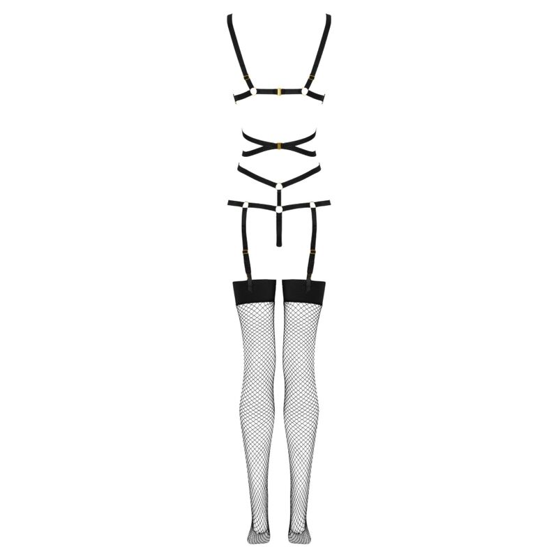 The top of the set consists of sexy black stripes, intertwined on the belly and connected with rings. The straps at the top elegantly surround the bust without covering it, while at the bottom they gently transform into a thong. Individual straps run down both sides of the thong, charmingly hugging the hips. The lower part of the set consists of black stockings of adjustable length, made of mesh. The stockings are fastened with clasps to the top element of the outfit, in front and back.