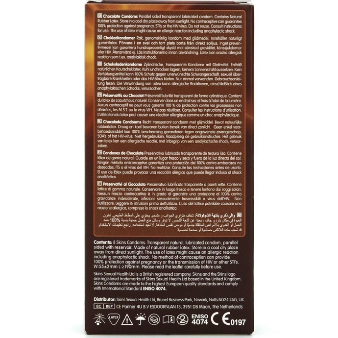 Introducing our new chocolate flavor 8-pack, featuring a sleek, ready-to-use design and up to 33% more condoms than the market leader. Appeal to those looking for a fun, high-quality intimate product with Skins chocolate flavor condoms. These individually wrapped condoms combine pleasurable taste with superior protection, making them the ideal choice for adult product stores, pharmacies, and wellness retailers. These Skins condoms are a great way to combine two loves: sex and chocolate. Theyre lubricated and have a delicious chocolate aroma thats truly tempting, and they taste like chocolate too. Like all Skins condoms, theyre made from high-quality, dermatologically tested latex, giving you the protection you need.