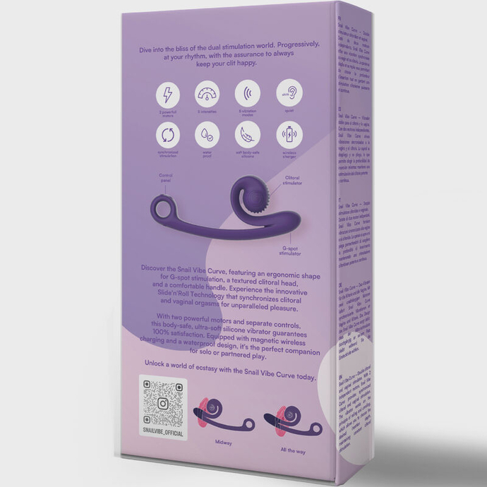 Discover the Snail Vibe Curve, featuring an ergonomic shape for G-spot stimulation, a textured clitoral head, and a comfortable handle. Experience the innovative Slide'n'Roll Technology that synchronizes clitoral and vaginal prgasms for unparalleled pleasure.