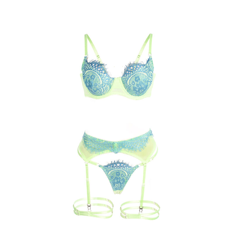 SUBBLIME - 955328 BRA SET WITH LACE AND GARTER LINES GREEN AND BLUE L/XL